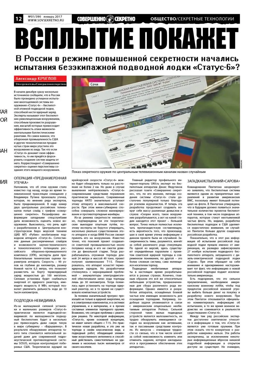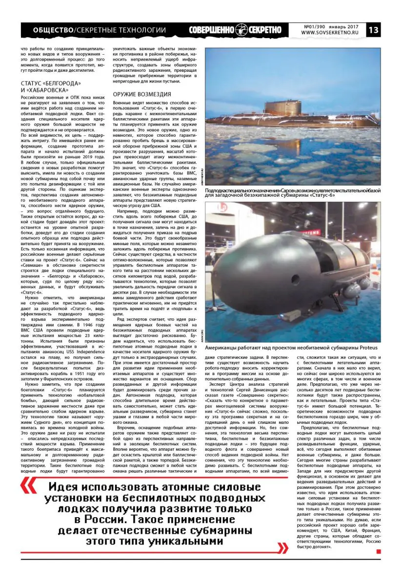 Между тем ряд российских экспертов достаточно скептически относится к информации о том, что «Статус-6» является уже готовым оружием. При этом сказать что-то конкретное о разработке наверняка нельзя. Эти работы засекречены, за исключением некоторых информационных вбросов никакой подробной информации в открытом доступе не существует. Но очевидно, что работы по созданию принципиально новых видов и типов вооружения – это долговременный процесс: до того момента, когда появится прототип, могут пройти годы и даже десятилетия.
