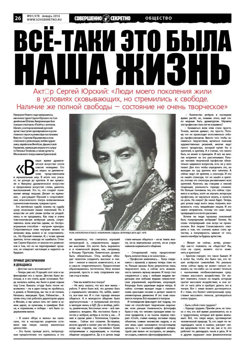 Актёр Сергей Юрский: «Люди моего поколения жили в условиях сковывающих, но стремились к свободе. Наличие же полной свободы – состояние не очень творческое»