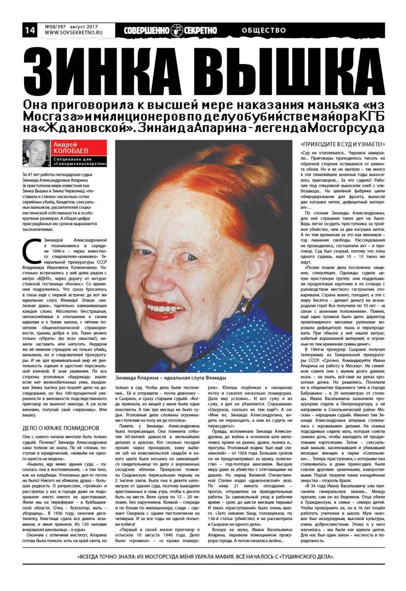 За 47 лет работы легендарная судья Зинаида Александровна Апарина (в преступном мире известная как Зинка Вышка и Зинка Червонец) «поставила к стенке» несколько сотен серийных убийц, бандитов, сексуальных маньяков, расхитителей социалистической собственности в особо крупных размерах. А общая цифра присуждённых ею сроков выражается тысячелетиями.