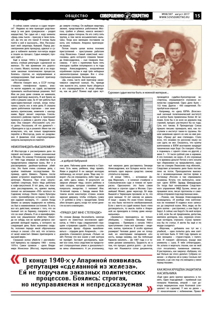Ещё в конце 1940-х у Апариной появилась стойкая репутация «сделанной из железа». По тем временам это дорогого стоило. Может, поэтому ей и не поручали заказных политических процессов. Боялись: строгая, но неуправляемая и непредсказуемая. Ещё вынесет приговор «не по сценарию».