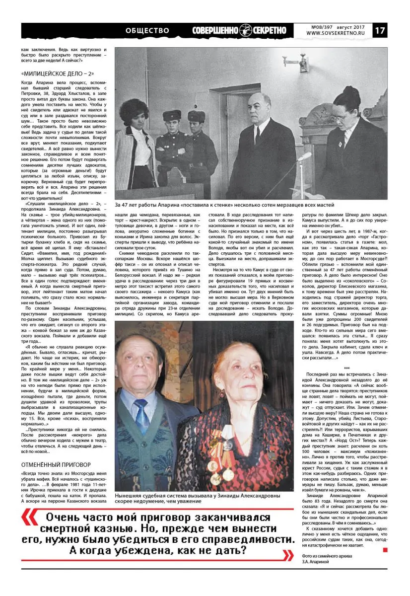 И вот через шесть лет, в 1987-м, когда я рассматривала дело «торг «Гастроном», появилась статья в газете: мол, как это так – такая-сякая Апарина, которая дала высшую меру невиновному, до сих пор работает в Мосгорсуде?! Облили грязью – вспомнили мой единственный за 47 лет работы отменённый приговор. А дело было интересное! Оно было выделено из «соколовского» – Соколов, директор Елисеевского магазина, к тому времени был уже расстрелян. Находились под стражей директор торга, его заместитель, директора очень многих московских магазинов, которые давали взятки. Суммы огромные! Мною были уже допрошены 200 свидетелей