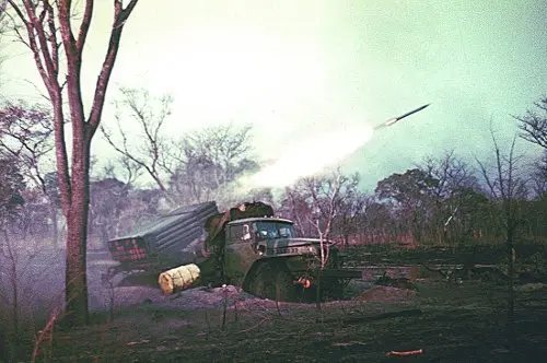 12 октября. Сегодня утром в 6:45 колонна опять подверглась нападению унитовцев. Но ответный огонь наших средств (Б-10, 120-мм миномёты, БМ-21, Град-1П) не позволил противнику вести прицельный огонь. В 10:40 опять появилась южноафриканская авиация. Отбомбилась по расположению 21-й бригады. Видимо, мстят за вчерашнее. Мы подошли достаточно близко к позициям южноафриканцев. По радиостанции Р-123 чётко слышны их переговоры. Говорят преимущественно по-английски. А сегодня в эфире вдруг заговорили… по-польски. Я разобрал несколько фраз: «Цо пан хце (что хочет пан)?», «Борзо добже» (очень хорошо) и потом: «Слухаю уважливо (слушаю внимательно)». Ответов второго корреспондента слышно не было. Долго гадали, что бы это значило, пока не сошлись во мнении, что это, должно быть, общались в эфире южноафриканцы польского происхождения. А может быть, польские наёмники?