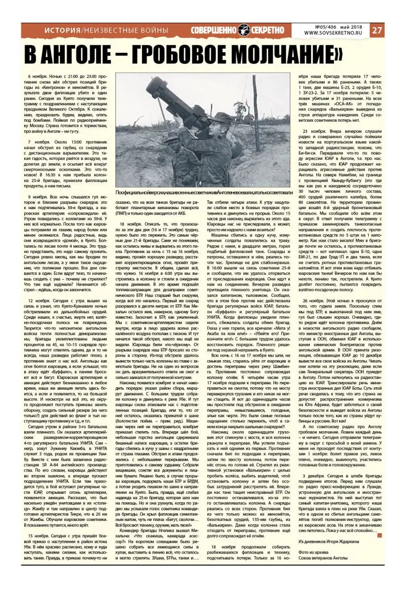 26 ноября. Этой ночью я проснулся от того, что гудела земля. Поскольку спим мы под БТР, в выкопанной под ним яме, гул был слышен хорошо. Очевидно, где-то рядом идёт колонна противника. Днём в новостях ангольского радио сообщили, что министр иностранных дел Анголы, выступая в ООН, обвинил ЮАР в использовании химических боеприпасов против ангольской армии. В ООН принята резолюция, обязывающая ЮАР до 10 декабря вывести все свои войска из Анголы. Чихать они хотели на эту резолюцию, даже если сам Генеральный секретарь ООН приедет в Анголу. Потом наткнулись на радиостанцию из ЮАР. Транслировали речь министра иностранных дел ЮАР Боты. Суть этой речи сводилась к тому, что его страна не допустит распространения коммунизма на Юге Африки, будет заботиться о своей безопасности и выведет войска из Анголы только после того, как из страны уйдут кубинцы и русские. Вот как!