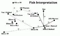 Восстановленный М.Фиш участок звездного неба со стороны созвездия Сети. Индексом Sun обозначено наше Солнце. Числа соответствуют расстояниям в световых годах |