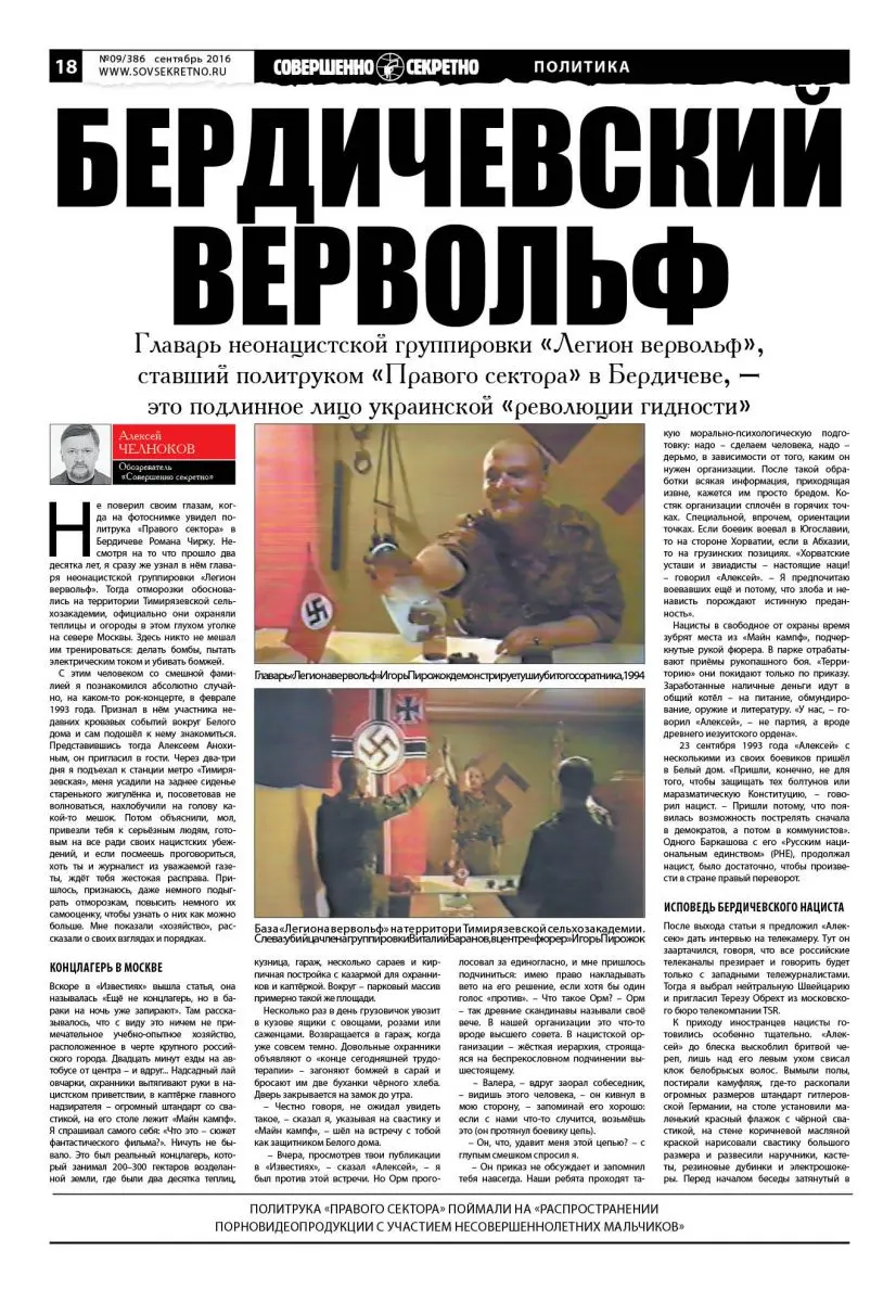 Не поверил своим глазам, когда на фотоснимке увидел политрука «Правого сектора» в Бердичеве Романа Чирку. Несмотря на то что прошло два десятка лет, я сразу же узнал в нём главаря неонацистской группировки «Легион вервольф». Тогда отморозки обосновались на территории Тимирязевской сельхозакадемии, официально они охраняли теплицы и огороды в этом глухом уголке на севере Москвы. Здесь никто не мешал им тренироваться: делать бомбы, пытать электрическим током и убивать бомжей.