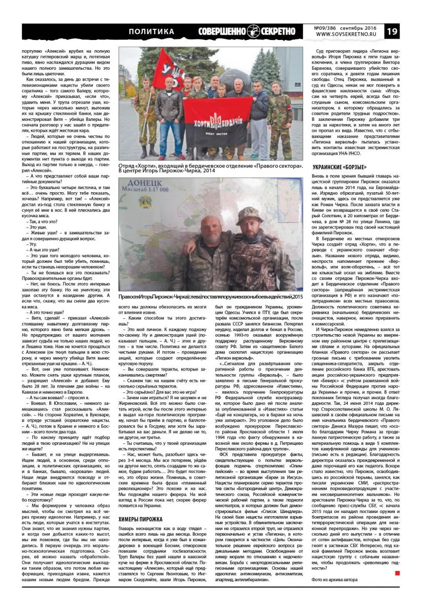 И Чирка-Пирожок немедленно взялся за строительство новой Украины во вверенном ему районном центре с прилегающими сёлами и хуторами. На официальных бланках «Правого сектора» он рассылает грозные письма с требованием уволить священника-сепаратиста, закрыть отделение российского банка ВТБ, арестовать акции российско-украинского предприятия «Беверс» «с учётом развязанной войны Российской Федерации против народа Украины» и прочее, и прочее. В ответ поклонник Гитлера получал иногда благодарности. Так, 24 июня 2014 года директор Старосолотвинской школы М. О. Ляшевский в своём официальном письме на имя начальника бердичевского «Правого сектора» Дениса Мазура пишет, что «особо благодарим Чирку Романа за проделанную патриотическую работу, а также за материальную помощь в виде 5 комплектов камуфляжной одежды для учеников» (письмо есть в редакции). Благодарность директора оказалась преждевременной и даже порочащей его как педагога. Вскоре стало известно, что Пирожок, освободившись из российской тюрьмы, занялся, как писали украинские СМИ, «распространением порновидеопродукции с участием несовершеннолетних мальчиков». Но арестовали Пирожка-Чирка за то, что, по сообщению пресс-службы СБУ, «с начала 2015 года он наладил поставки оружия и боеприпасов из района проведения антитеррористической операции для незаконной перепродажи». Но уже через несколько дней его выпустили – в отличие от сотен антифашистов, которых без суда гноят в застенках СБУ. Интересно, под какой фамилией Пирожок вновь возглавит нацистскую группу с собачьим названием, чтобы продолжать «революцию гидности»?
