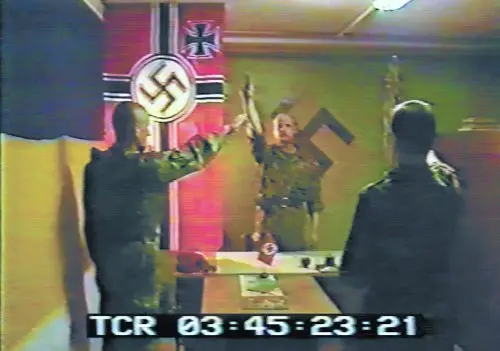 К приходу иностранцев нацисты готовились особенно тщательно. «Алексей» до блеска выскоблил бритвой череп, лишь над его левым ухом свисал клок белобрысых волос. Вымыли полы, постирали камуфляж, где-то раскопали огромных размеров штандарт гитлеровской Германии, на столе установили маленький красный флажок с чёрной свастикой, на стене коричневой масляной краской нарисовали свастику большого размера и развесили наручники, кастеты, резиновые дубинки и электрошокеры. Перед началом беседы затянутый в портупею «Алексей» врубил на полную катушку гитлеровский марш и, потягивая пиво, явно наслаждался дурацким видом нашего полного замешательства. Но это были лишь цветочки.
