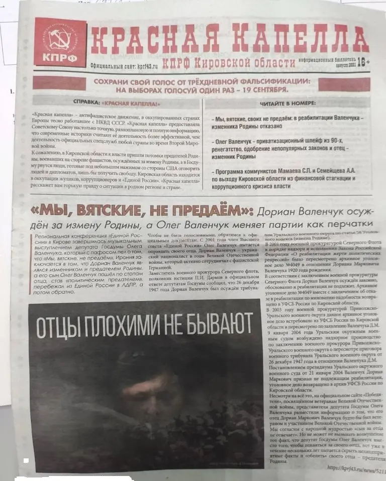 Так, например, издание обвинило отца кандидата в Госдуму - депутата Госдумы 7-го созыва Олега Валенчука - в службе в рядах украинских националистов в годы Великой Отечественной войны и предательстве Родины. При этом, не представив ни доказательств, ни извинений за откровенную клевету на ветерана, награждённого орденом Великой Отечественной войны.