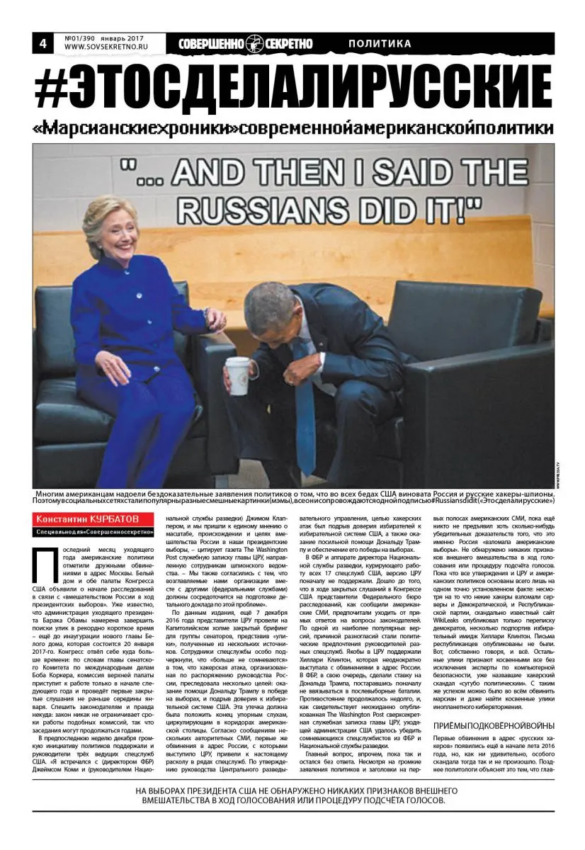 В предпоследнюю неделю декабря громкую инициативу политиков поддержали и руководители трёх ведущих спецслужб США. «Я встречался с (директором ФБР) Джеймсом Коми и (руководителем Национальной службы разведки) Джимом Клаппером, и мы пришли к единому мнению о масштабе, происхождении и целях вмешательства России в наши президентские выборы, – цитирует газета TheWashingtonPost служебную записку главы ЦРУ, направленную сотрудникам шпионского ведомства. – Мы также согласились с тем, что возглавляемые нами организации вместе с другими (федеральными службами) должны сосредоточится на подготовке детального доклада по этой проблеме».