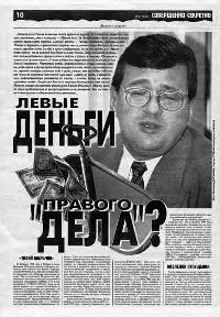 В пятом номере «Совершенно секретно» в статье «Левые деньги «Правого дела» излагалась версия банкротства инвестиционного банка «Восток-Запад». Борис Федоров, в течение двух лет возглавлявший банк, был с этой версией категорически не согласен и потребовал от газеты сатисфакции. Беседуя с нашим корреспондентом Юлией ЛАТЫНИНОЙ в своем роскошном кабинете на Поварской, 10, не на шутку разобиженный Федоров не скрывал досады и, казалось, готов был отстаивать свою правоту в кулачном бою. Однако, убедившись, что у журналистов «Совершенно секретно» отсутствуют и хвост, и рога, был недалек от того, чтобы предложить собеседнице чаю.