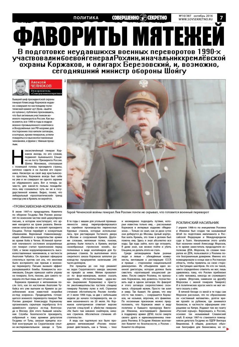 Бывший шеф президентской охраны генерал Александр Коржаков недавно совершил по-настоящему политический каминг-аут (букв. «выйти из чулана»), публично признавшись, что был активным участником военного переворота в России. Как выясняется, все 1990-е годы в недрах военно-промышленного комплекса и Вооружённых сил РФ незримо для посторонних глаз кипели заговоры, в которых, кроме генералов, успели повариться и высокопоставленные чиновники, и фрики с тёмным прошлым.