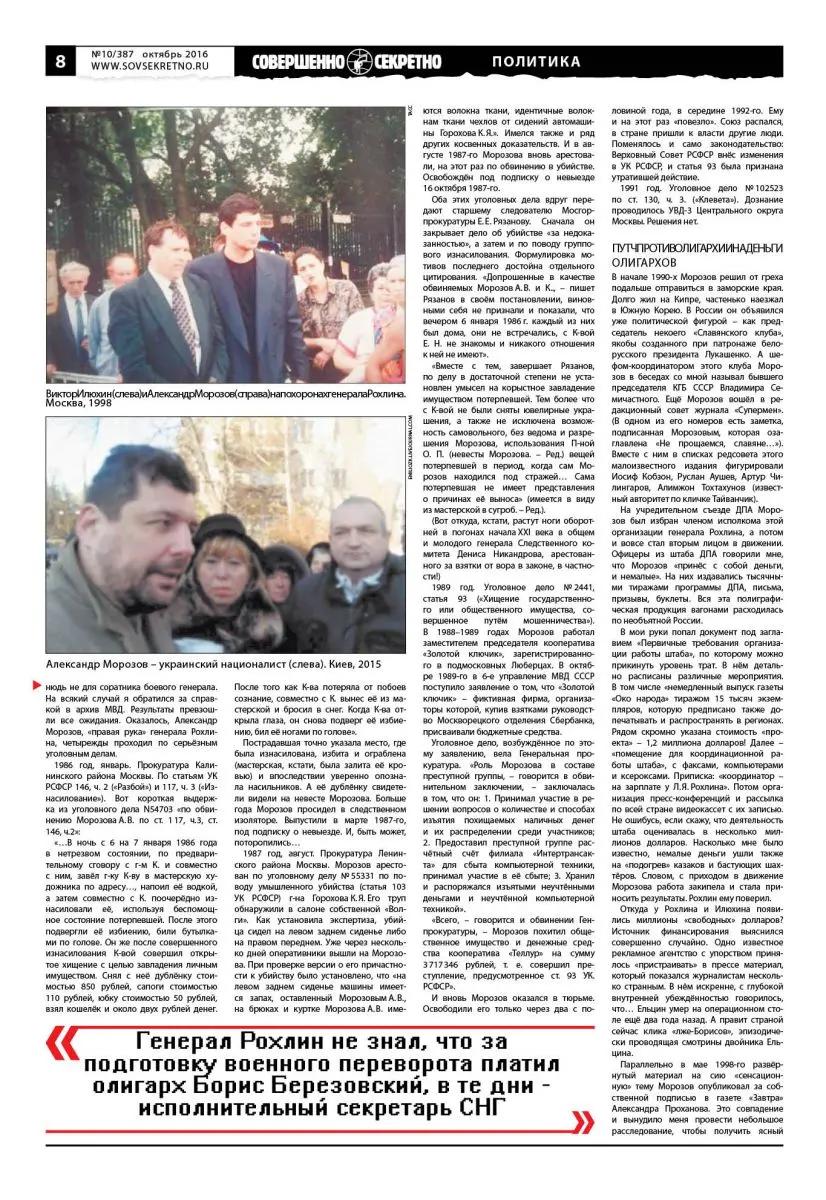 В личной беседе со мной в те годы сам Морозов рассказал, что по образованию он «системный математик», долгое время провёл за рубежом, где занимался бизнесом, в частности офшорными операциями на Кипре. Издавал там же газету «Русский курьер». Вернувшись в Россию, основал так называемый Славянский клуб. В конце 1997-го становится помощником депутата Госдумы из ЛДПР Виктора Вишнякова. В общем, довольно обычная биография для бизнесмена, но отнюдь не для соратника боевого генерала. На всякий случай я обратился за справкой в архив МВД. Результаты превзошли все ожидания. Оказалось, Александр Морозов, «правая рука» генерала Рохлина, четырежды проходил по серьёзным уголовным делам.