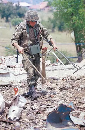 Сапёр российских миротворческих сил работает на месте бомбёжки самолётами НАТО склада боеприпасов югославских вооружённых сил