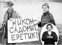 А губерния тем временем бурлит. Каждая сводка теленовостей начинается с «темы дня» – бунт на церковном корабле. Демонстрируют кадры: десятки верующих с антиниконовскими плакатами круглосуточно стоят в пикетах возле храмов… К одному из них милиции понаехало, как на захват банды головорезов… Православные Нижнего Тагила собираются объявить свой город «свободной от Никона зоной». В выражениях уже никто не стесняется…