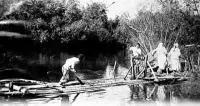 Рабочий промывает в старательском ковше собранный золотой песок |