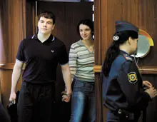 Никита Тихонов и Евгения Хасис (в центре) перед началом заседания в Мосгорсуде