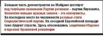 Надо еще учесть, что люди из провинции в Киеве себя чувствуют неуверенно, озираются по сторонам несколько затравленно, больше всего, видимо, боятся потеряться в большом городе, держатся друг друга и, главное, руководителей. Так что дисциплина образцовая. Под Майданом, в том самом подземном переходе, – огромный торговый центр «Глобус» наподобие московского, что под Манежной площадью. Так вот, за все эти дни, неоднократно спускаясь в «Глобус» то пообедать, то кофе выпить, я ни разу не встретил там этих самых митингующих в защиту Рады провинциалов (их легко узнать и отличить от киевлян по манере поведения, не говоря уже о красно-розово-голубой униформе). Хотя, казалось, приехали в столицу из глубинки, живущей куда беднее Киева: в самый раз воспользоваться моментом, пройтись по магазинам, чтобы, как герой Высоцкого, тестю купить «что-нибудь армянского розлива».