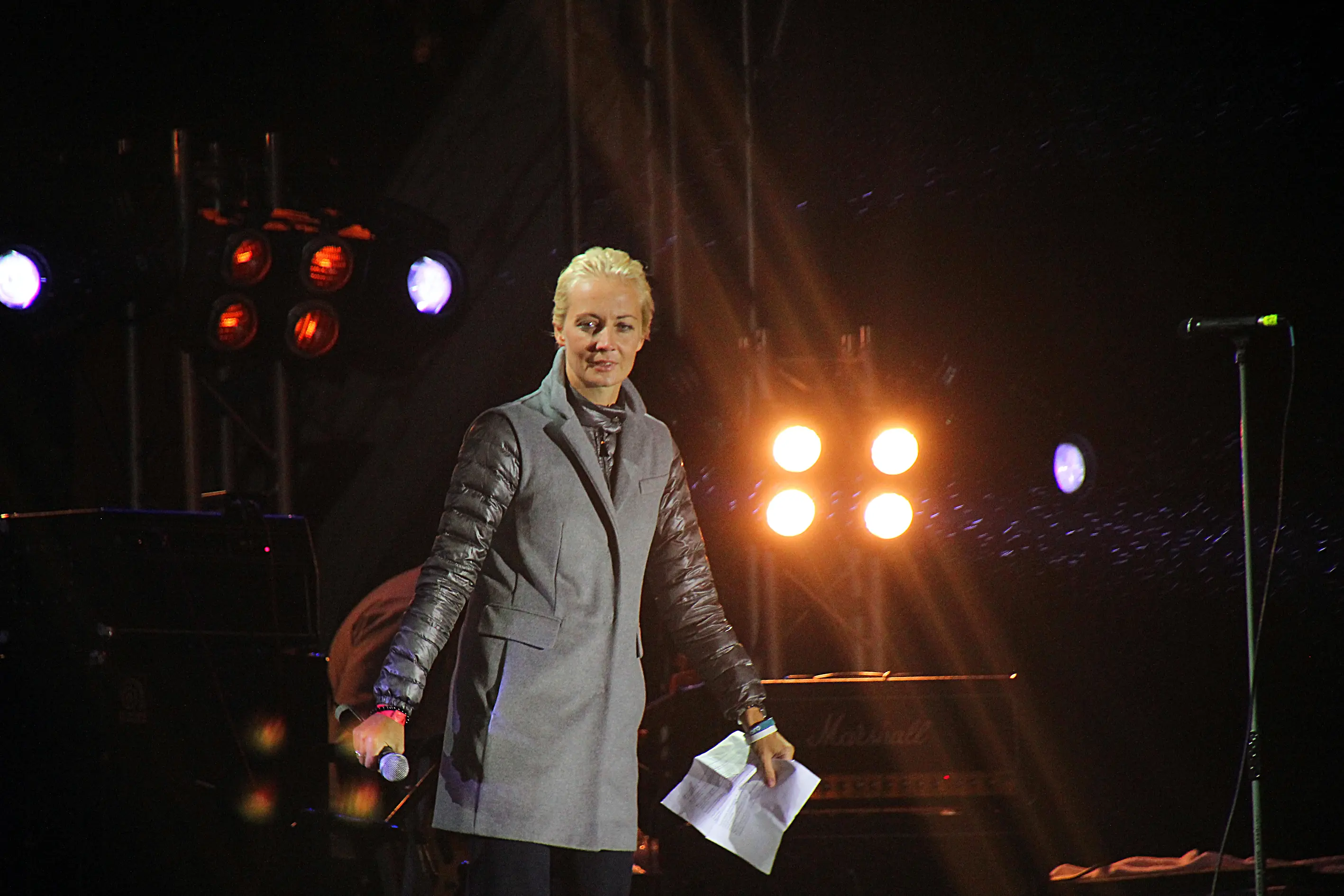 «Никаких пока речей. Я здесь, чтобы вы меня увидели, чтобы сказать - я здесь, вместе с вами. Спасибо вам огромное, на таких людях как вы всё и держится: на тех, кто приходит первыми, кто приходит вовремя и кто терпеливо стоит под дождем. Я надеюсь, что сейчас вы не только стоите терпеливо, но насладитесь отличной музыкой. Вы огромные молодцы, я вас всех люблю. Если бы у меня были огромные руки, я бы вас всех обнял», — сказал Навлаьный.