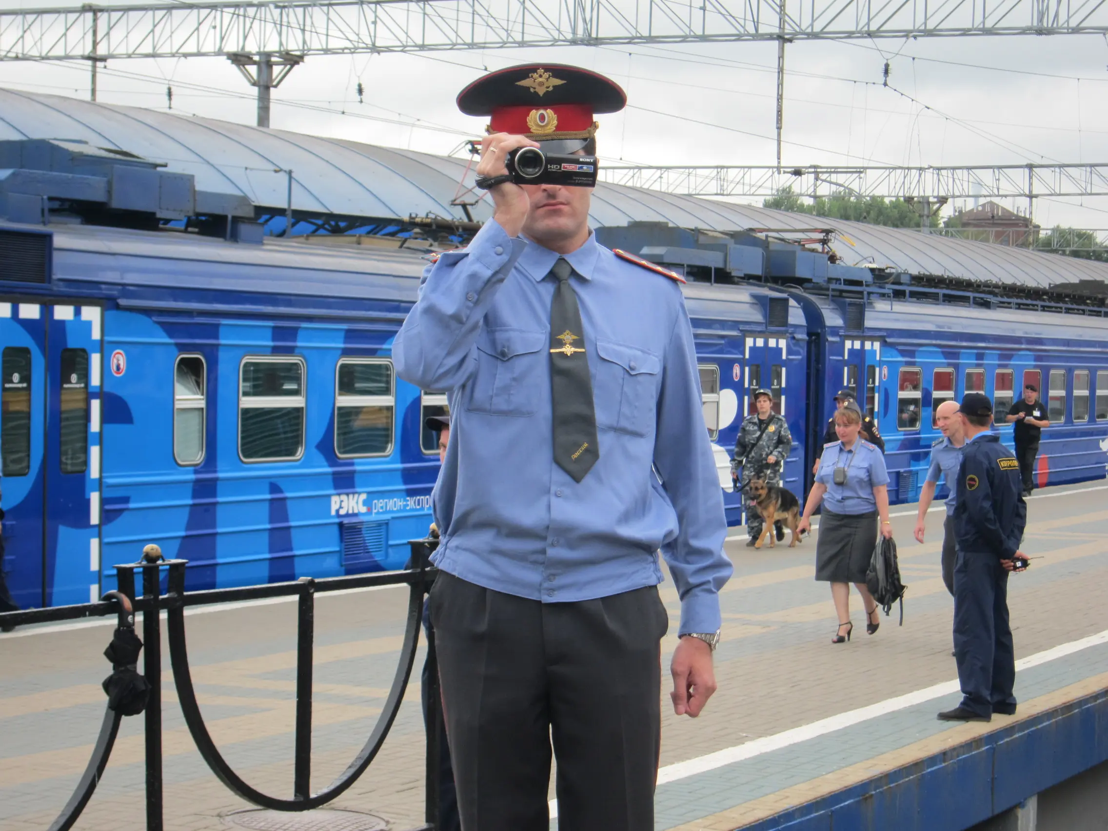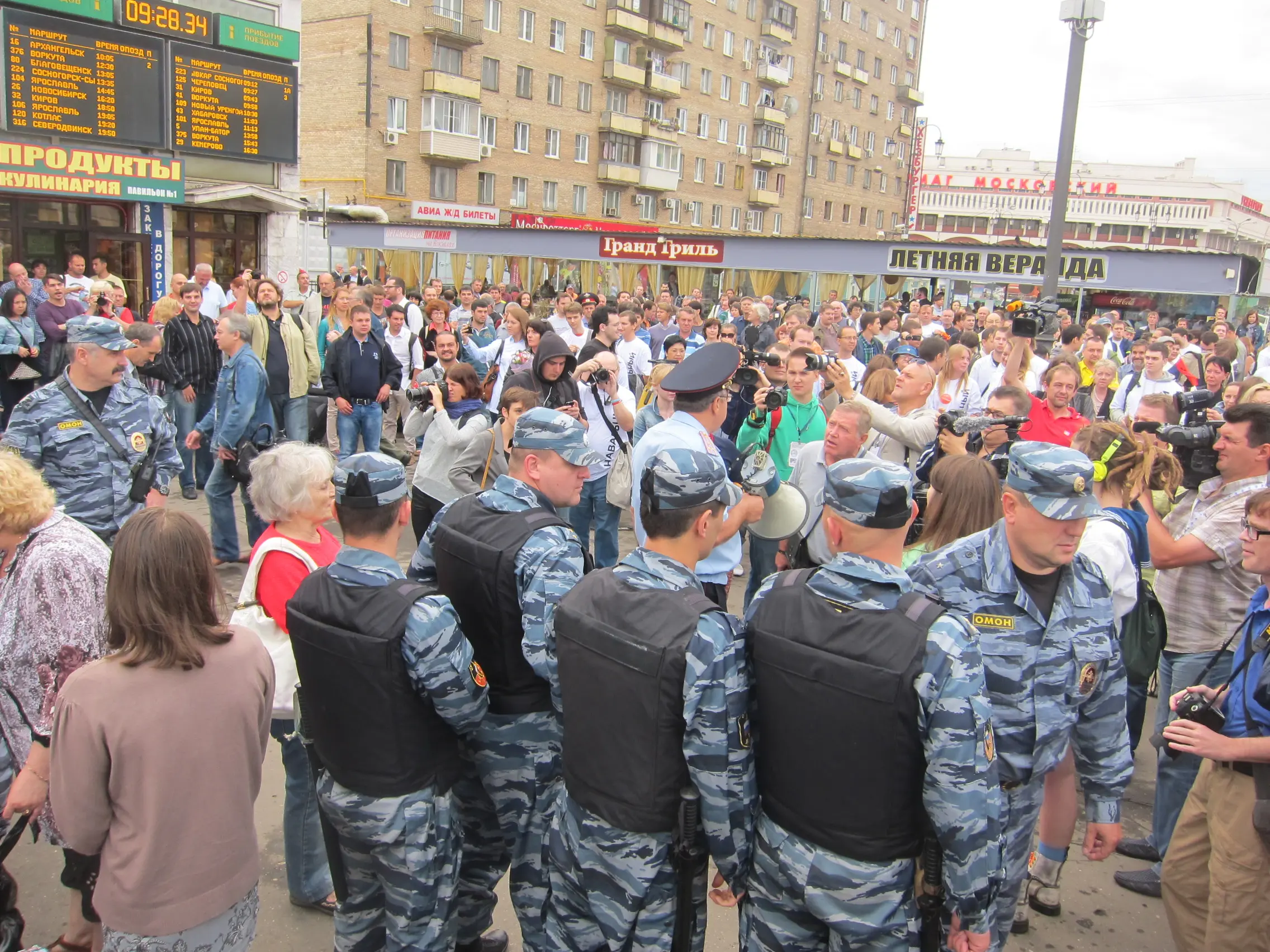 Задолго до прибытия Алексея Навального на вокзал приехал ОМОН. При этом полиция во время всего мероприятия вела себя корректно, ограничиваясь призывами покинуть площадку перед путями и выстроиться по двум сторонам коридора. Люди не сопротивлялись, однако давка все равно произошла: проход шириной примерно в 2 метра был слишком узким для нескольких десятков журналистов. Несмотря на то, что активисты раздавали агитационные материалы, скандировали «Навальный», «Офицеров» и «Мы здесь власть» и включили музыку через переносные колонки, задержаний не было.