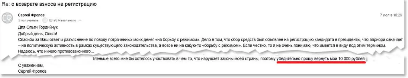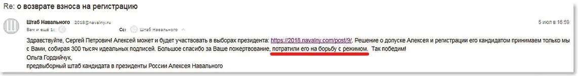 Во многих странах действует такая практика, когда собираются деньги на регистрацию кандидата на предстоящих выборах и аккумулируются в специальных фондах до начала избирательной кампании. Однако вы пишете, что деньги уже потрачены, а ведь официально избирательная кампания ещё даже не была объявлена. Это вызывает определённые вопросы и подозрения в нецелевом расходовании средств. А это, как вы понимаете, уже нарушение закона. Меньше всего мне бы хотелось участвовать в чём-то, что нарушает законы моей страны, поэтому убедительно прошу вернуть мои 10 000 рублей по указанным в предыдущем письме реквизитам.