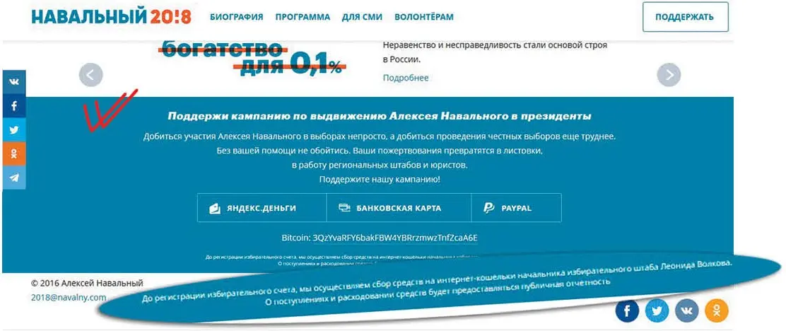 Кстати, про крупный и мелкий шрифт на сайте «Навальный 20!18». Эту деталь в своё время заметили мои коллеги из Агентства федеральных расследований FLB.ru, которые в статье «Кошелёк Навального» написали: «Как в стародавние времена в договорах банков-мошенников с вкладчиками на сайте Навального под броским воззванием «Поддержи кампанию по выдвижению в президенты» мелким-мелким шрифтом с трудом можно прочитать: «До регистрации избирательного счёта мы осуществляем сбор средств на интернет-кошельки начальника избирательного штаба Леонида Волкова. О поступлении и расходовании средств будет предоставляться публичная отчётность». Деньги населению предложили сбрасывать на личные кошельки (электронное средство платежа для расчётов электронными деньгами) Волкова в «Яндекс. Деньги» и платёжной системе PayPal, на личные счета Леонида Михайловича Волкова в Сбербанке и Альфа-банке и на криптовалютную систему Bitcoin». И далее журналисты FLB подробно расписали, как Навальный и Волков создали систему ухода от налогов и при этом грубо нарушили финансовые правила международных платёжных систем.
