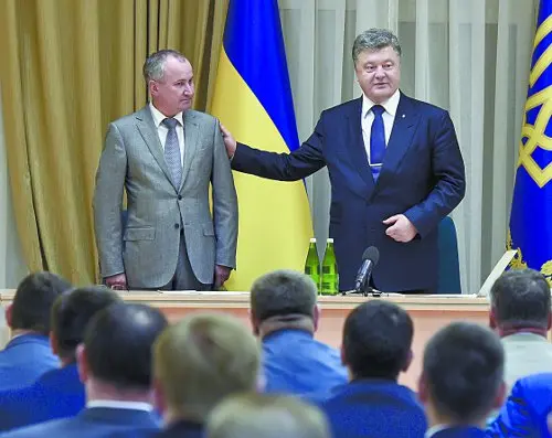 Через год после зачистки улик генерал Грицак возглавил СБУ. Президент Украины Пётр Порошенко представляет нового руководителя Службы безопасности Украины Василия Грицака, 3 июля 2015 года