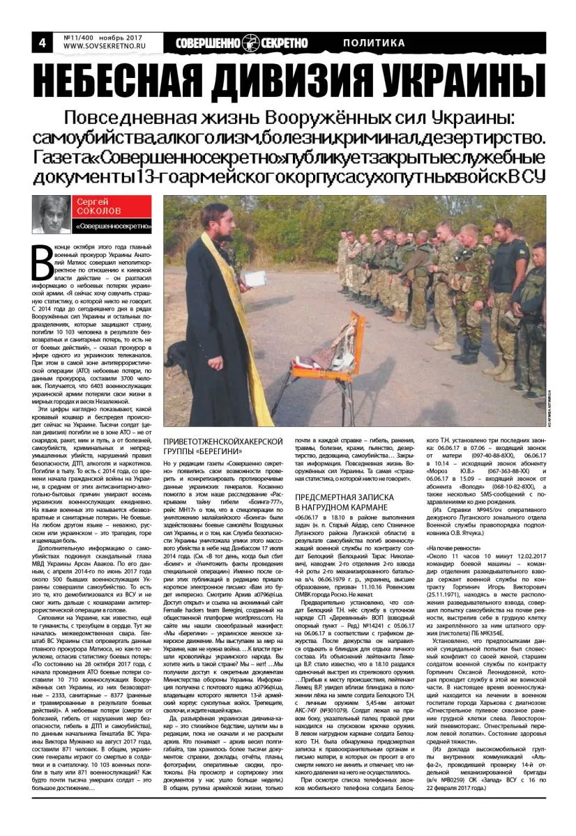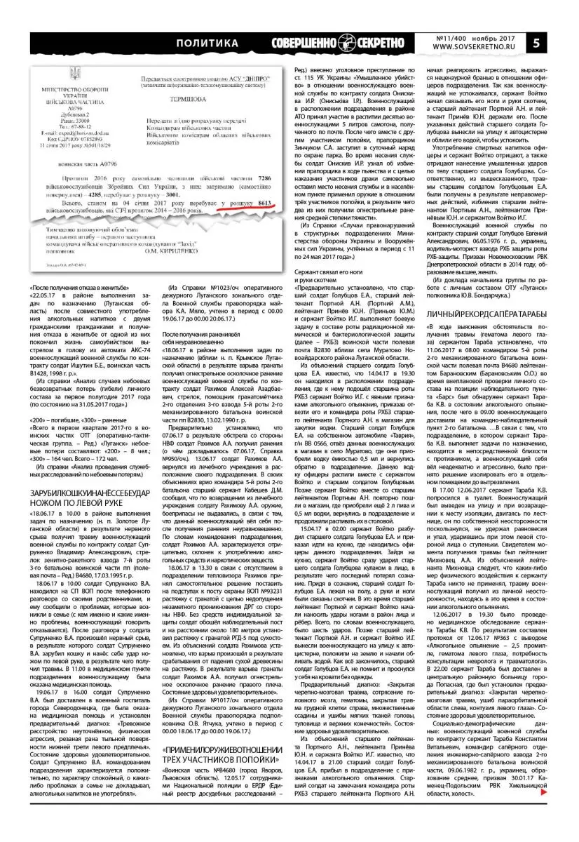 Повседневная жизнь Вооружённых сил Украины: самоубийства, алкоголизм, болезни, криминал, дезертирство. Газета «Совершенно секретно» публикует закрытые служебные документы 13-го армейского корпуса сухопутных войск ВСУ