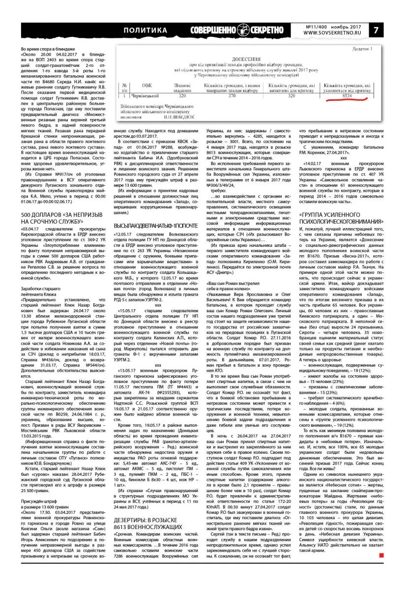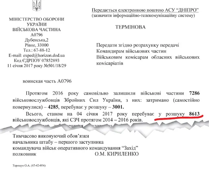 «Срочная. Командирам воинских частей. Военным комиссарам областных военных комиссариатов. …В течение 2016 года самовольно оставили воинские части 7286 военнослужащих Вооружённых сил Украины, из них: задержаны / самостоятельно вернулись – 4285, находится в розыске – 3001. Всего, по состоянию на 4 января 2017 года, находятся в розыске 8613 военнослужащих, которые совершили СЗЧ в течение 2014 – 2016 годов.