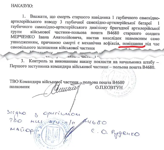 «15.05.17, в 11.53, находясь в отпуске, умер военнослужащий военной службы по контракту солдат Перепадин (Перепадін В.О), 1995 г. р., который в тяжёлом состоянии был доставлен в ВМКЦ Южного региона (город Одесса) после употребления алкогольных напитков с сослуживцем, военнослужащим военной службы по контракту солдатом Руденко М.В.».