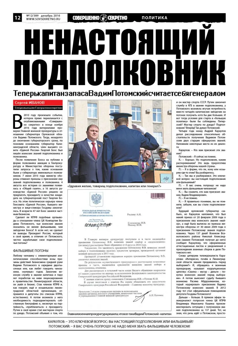 Странная у капитана Потомского память. За пару дней до его рассказа о событиях, происходивших во Всеволожске, орловская газета «Красная строка», о содержании которой ему еженедельно сообщают, вспоминала о том, что фальшивые звёздочки будущий орловский губернатор получил в 2009 году, а не десять лет назад. Зная трепетное отношение Потомского к военной форме, чинам, званиям и прочей атрибутике и учитывая то, что слова «имеет воинское звание – подполковник» сопровождали его во время подготовки к назначению секретарём Ленинградской областной организации КПРФ (осенью 2009 года), в его «забывчивости» стоит усомниться. Назначать главой регионального отделения Компартии капитана запаса – просто несолидно, а вот подполковника – совсем другое дело. И было это всё, напомним Вадиму Потомскому, не 10, а 7 лет назад.