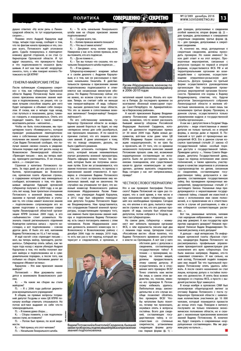 Снова цитируем тележурналиста Караулова: «Интересно, почём в Ленинградской области звания продавались перед выборами?» И, обращаясь к военным прокурорам, называет коррупционную цепочку: «Свалка – мусор – деньги – покупка воинских званий перед выборами». А потом выясняет судьбу бывшего военкома Расима Абдурахманова, который «курировал» присвоение Вадиму Потомскому воинских званий. В 2012 году тот стал официальным помощником депутата Госдумы Потомского