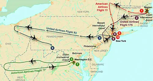 Карта с траекториями полётов всех четырёх угнанных 11 сентября авиалайнеров: AAL11, UL175, AAL77, UL93