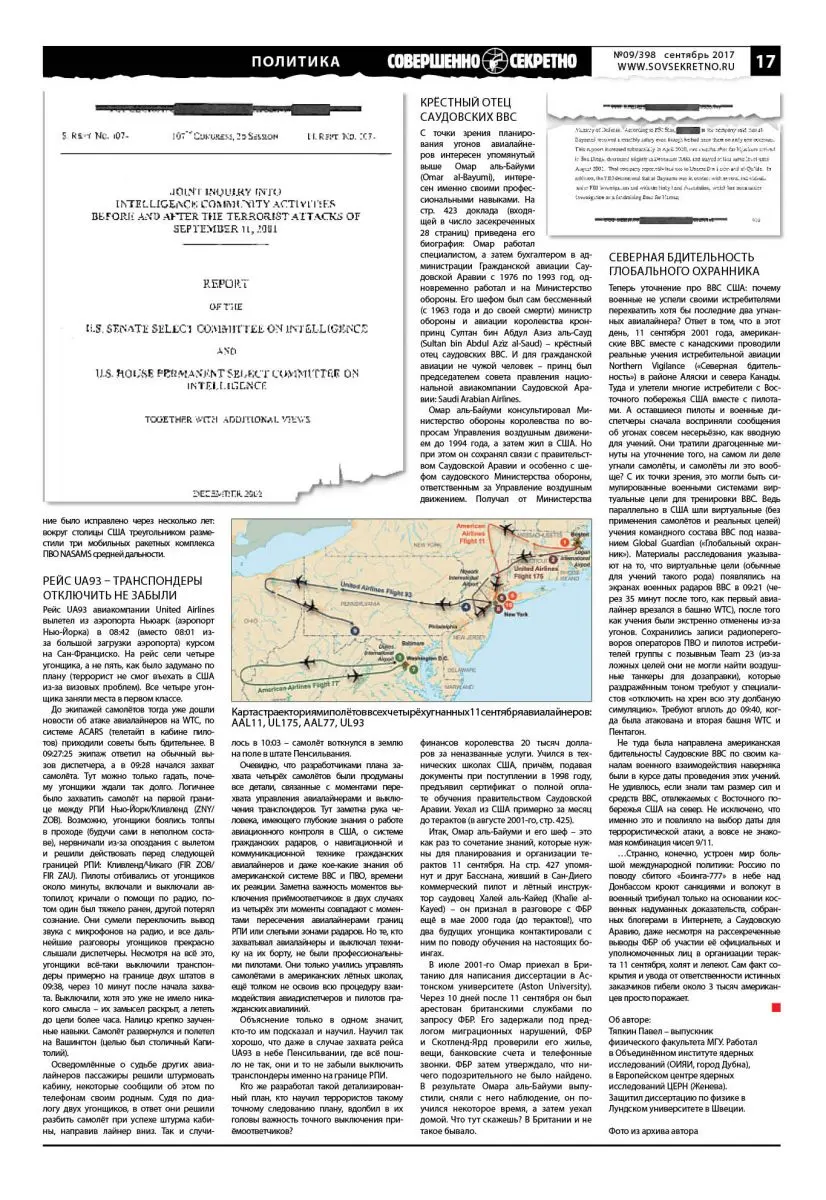 …Странно, конечно, устроен мир большой международной политики: Россию по поводу сбитого «Боинга-777» в небе над Донбассом кроют санкциями и волокут в военный трибунал только на основании косвенных надуманных доказательств, собранных блогерами в Интернете, а Саудовскую Аравию, даже несмотря на рассекреченные выводы ФБР об участии её официальных и уполномоченных лиц в организации теракта 11 сентября, холят и лелеют. Сам факт сокрытия и увода от ответственности истинных заказчиков гибели около 3 тысяч американцев просто поражает.