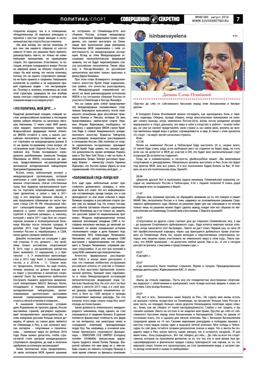 Антидопинговый скандал, разразившийся за несколько месяцев до Олимпиады-2016, имеет, пожалуй, два основных последствия: первое – безнаказанно рушатся судьбы спортсменов, второе – международные спортивные организации показали свою полную политическую ангажированность, замешанную на русофобии. Дневник двукратной олимпийской чемпионки Елены Исинбаевой в Instagram, её одиночная борьба за право оставаться достойной олимпийских призов с одной стороны и закулисье Международного олимпийского комитета (МОК) и Всемирного антидопингового агентства (WADA), разоблачивших и дискредитировавших себя в глазах мира, с другой.