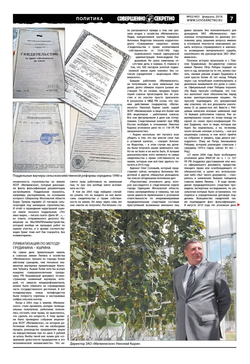 Но вскоре всё-таки узнали, что АОЗТ «Матвеевское» получило «в общую долевую собственность» 712,4 гектара на основании постановления главы администрации Одинцовского района №448 от 11.03.1996 года (и согласно государственному акту МО-20 №1027 от 05.06.1996 года). Но никто тогда – ни областные чиновники, ни прокурорские работники – не проверял, как писала газета «Дело №…», «каким образом земельный участок, переданный гражданам бесплатно в ходе реорганизации колхозов и совхозов, а также приватизации сельскохозяйственной земли, оказался у АОЗТ «Матвеевское», и законно ли он зарегистрирован…».