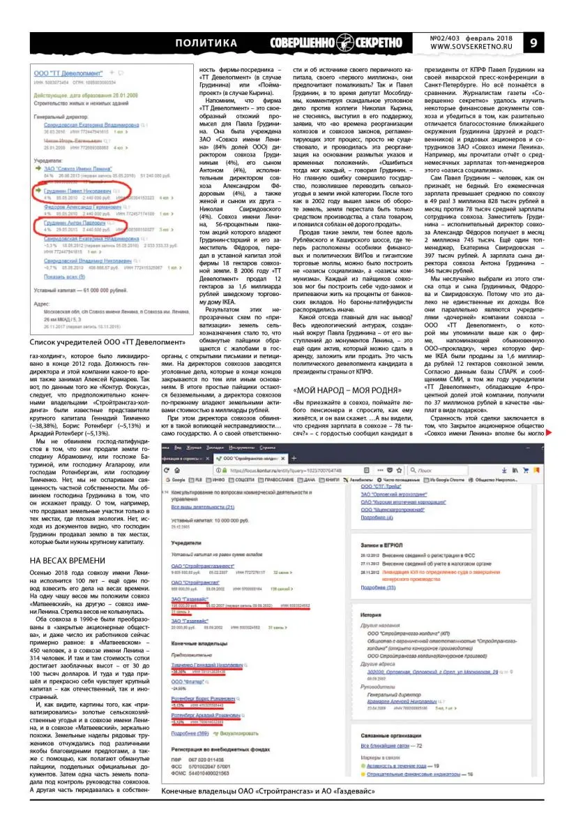 Газета «Совершенно секретно» располагает выпиской из Единого госреестра недвижимости, согласно которой «здание», раскинувшееся на 2 гектарах земли –по адресу Московская область, Ленинский район, сельское поселение имени Ленина, восточная промзона, владение 3, строение 5, – было продано ещё в 2009 году. Новым владельцем площади 20959,3 кв. м стала компания «Газдевайс». (Мы полагаем, что в ноябре 2009 года предметом торга были именно 2 гектара совхозной земли, поскольку, согласно выписке из ЕГРН, там началось строительство корпусов, которое завершилось только в 2003 году.) Взглянули на карту, сделанную со спутника, и сразу вспомнили, как Грудинин в разных интервью повторял, что совхоз, мол, избавляется от земель в зоне неблагоприятной экологической обстановки. Например, газете «Ведомости» (28 августа 2016 года) директор совхоза имени Ленина говорил так: «Эти участки рядом с Кольцевой автодорогой и Каширским шоссе почти нельзя использовать по сельхозназначению, так как рядом с дорогой тяжёлые металлы. Второй вопрос – рядом строится очень много жилья. И если ты сажаешь даже не овощные культуры, а саженцы, то они пропадают со страшной силой. Поэтому все участки рядом с крупными дорогами мы отправляем на реализацию».
