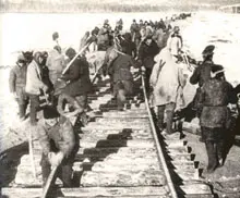 | Силами зэка велись большие стройки сталинских времен. На фото: заключенные укладывают рельсы | |