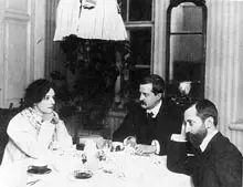 | Молодой Григорий Ламздорф был частым гостем в доме Мережковских. На фото: Зинаида Гиппиус, Дмитрий Философов, Дмитрий Мережковский, 1920-е годы | |