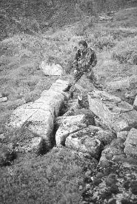 При внимательном знакомстве с местностью сразу стало ясно, как образовалась дорога из огромных плит. Дело в том, что горный массив тут сложен из графитового сланца. В незапамятные времена в скалах выветривалась порода, в трещины попадала вода, постепенно выламывались плоские геометрические блоки, которые сползали со склона. Блоки эти, наползая один на другой, соскальзывали вниз, вплоть до дна озера, и образовали «дорогу». Если внимательно посмотреть на скальный склон, там видны следы «съезда» этих блоков.