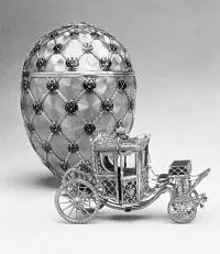При изучении счетов на другие яйца можно заметить, что в них не указывали на наличие ключа к механическим сюрпризам, а сами изделия описывались телеграфным стилем. «Яйцо желтой эмали и карета» – это о «Коронационном» яйце. А между тем об этой работе знаменитого Михаила Перхина есть что сказать. Рисунок золотистой эмали яйца имитирует солнечные лучи, оно оплетено решеткой из лавровых лент, на пересечении которых закреплены орлы черной эмали, каждый из которых украшен бриллиантом. А в верхней части яйца рубинами и бриллиантами выложена монограмма императрицы Александры Федоровны. Крохотную коронационную карету не описываю за нехваткой места.