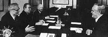 | Встреча в Кремле: Суслов, Брежнев, Пономарев, Гэс Холл. Изображение сидевшего рядом с Холлом Морриса Чайлдса на опубликованной в «Правде» фотографии было почему-то замазано. Однако лист бумаги, лежавший перед Чайлдсом, невнимательный ретушер замазать забыл | |