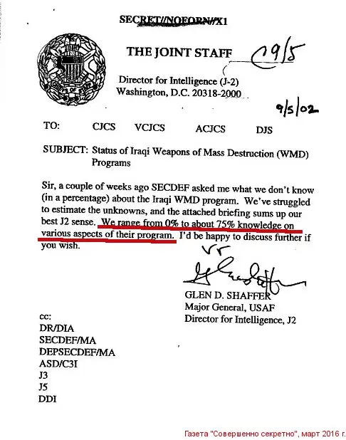 Пятого сентября 2002 года главе Объединённого комитета начальников штабов генералу Ричарду Майерсу доставили совершенно секретный пакет от министра обороны США. Сопроводительная записка от главы Пентагона Дональда Рамсфельда была предельно лаконичной: «Пожалуйста, ознакомься с материалами о том, чего мы не знаем об оружии массового поражения в Ираке. Это и правда очень серьёзно».