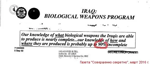 Существует ли в Ираке программа по созданию бактериологического оружия? По данным аналитиков, в стране полностью создана технологическая цепочка для этого и ранее в стране существовало промышленное производство штаммов сибирской язвы, рицина и других компонентов. Но все эти данные к 2002 году безнадёжно устарели. «Мы не можем с уверенностью назвать ни одного центра в Ираке, где бы производилось, испытывалось или хранилось биологическое оружие», – признают разведчики.