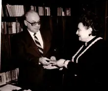 | Директор издательства «Прогресс» Вольф Седых вручает руководителю секретной редакции Марии Хасхачих памятную медаль в честь 50-и летия издательства | |