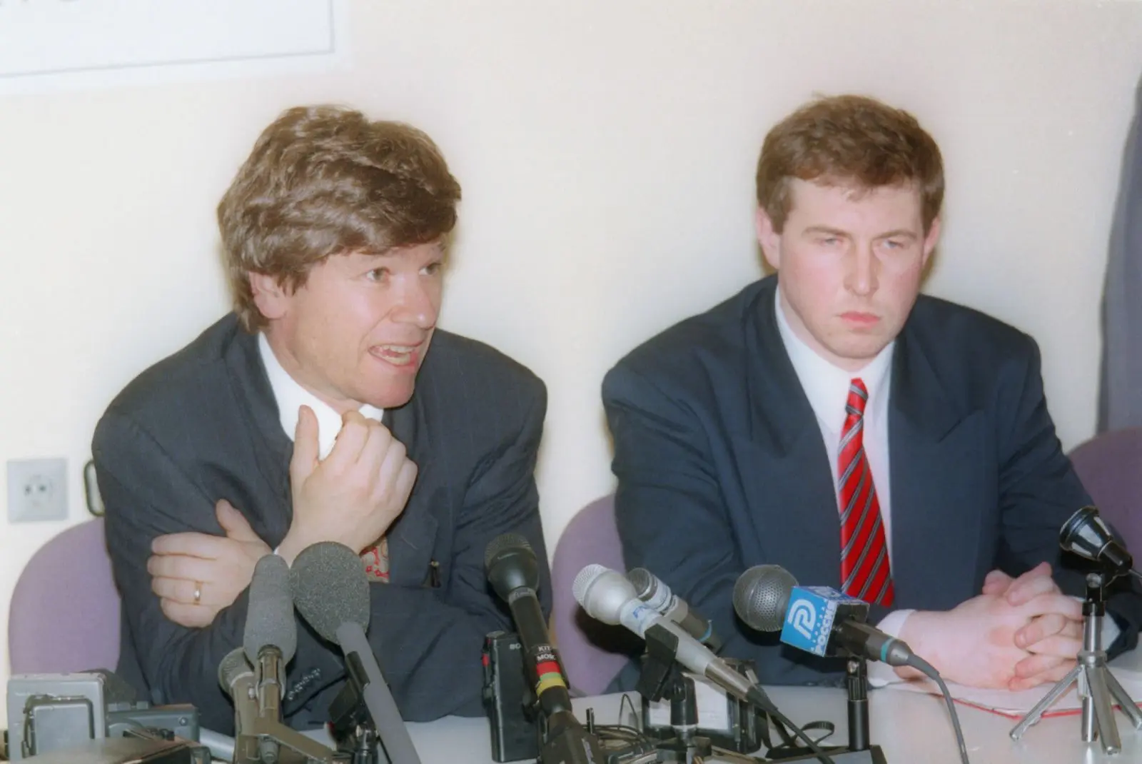 На фото: ДЖЕФФРИ САКС И АНДРЕЙ ИЛЛАРИОНОВ ВО ВРЕМЯ ПРЕСС-КОНФЕРЕНЦИИ, 1995 ГОД