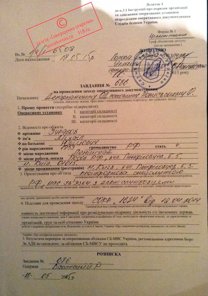 Как видим, в оперативную разработку СБУ («дело СОКР «1624») российский посол попал ещё 12 апреля 2014 года, через месяц после референдума и воссоединения Крыма с Россией. Повод для слежки и перлюстрации его дипломатической корреспонденции прост, как украинская галушка – Михаил Зурабов, оказывается, занимался «разведывательно-подрывной деятельностью». Не посол, а целый диверсант в степях Украины. Целый год наш дипломат был в оперативной разработке, а к маю 2015 года Валентин Наливайченко (теперь уже бывший глава СБУ) озадачил некоего оперативника из департамента документирования Р. Баранецкого заданием № 686, первой категории сложности – добраться до переписки посла. Что из этого вышло, мы не знаем. Графа о результатах выполненного задания в этом документе на тот момент была не заполнена.
