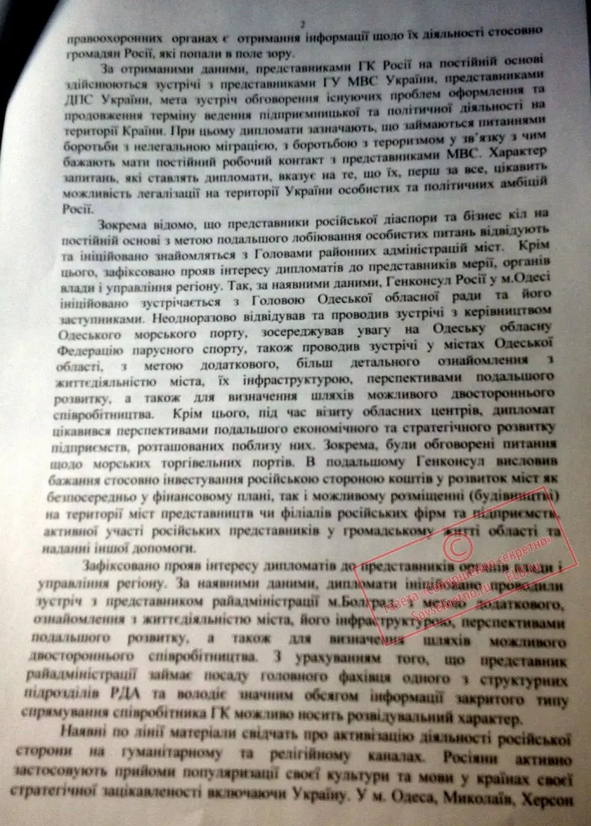 …Так, по имеющимся данным, Генконсул России в Одессе инициированно встречается с председателем Одесского областного совета и его заместителями. Неоднократно посещал и проводил встречи с руководством Одесского морского порта, сосредоточивал внимание на Одесской областной Федерации парусного спорта…