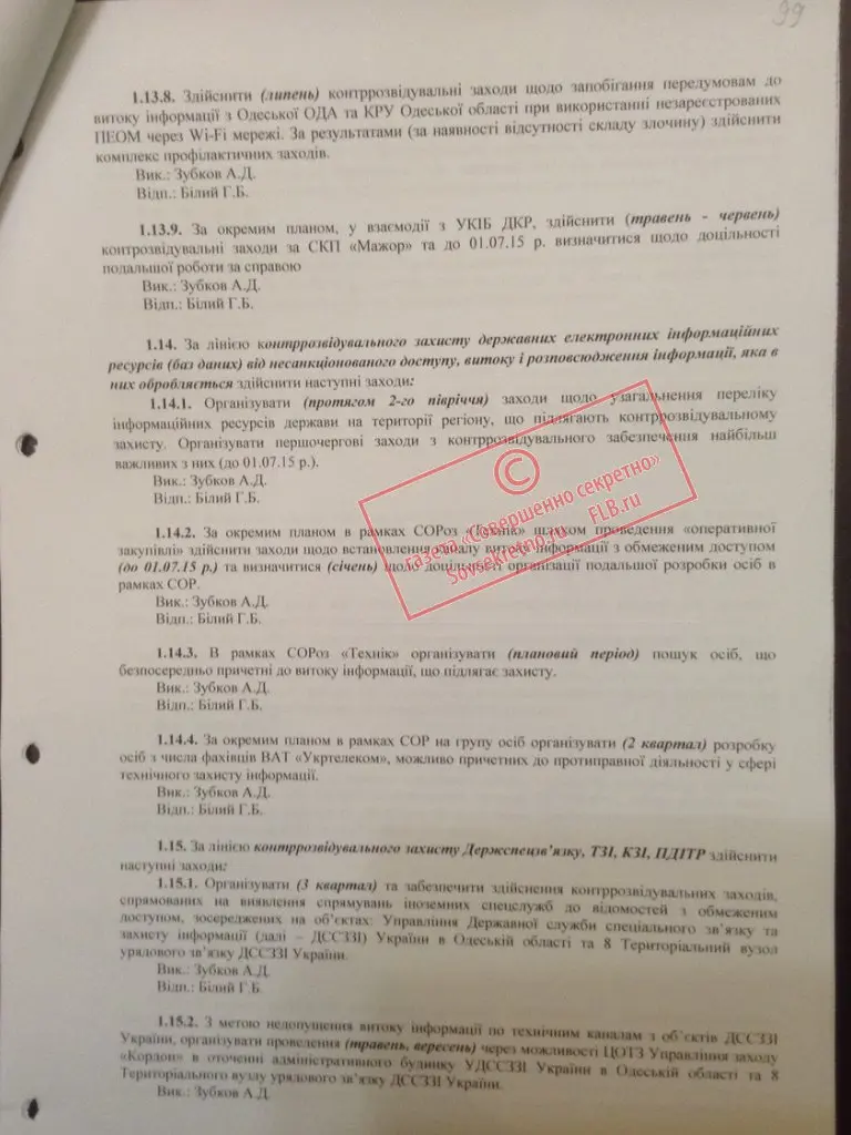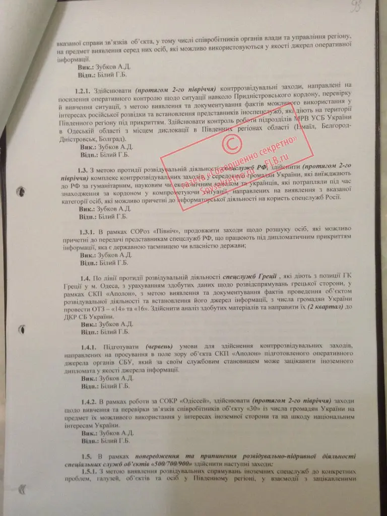 Ещё раз повторим, нас не удивляют недружественные действия СБУ против российских дипломатов. Киевская власть живёт в парадигме «во всех бедах Украины виновата Россия» – так проще скрывать от украинского народа свои грехи идиотизма и мздоимства. Но вот агрессивная охота за дипломатами стран Евросоюза и других государств нас впечатлила. Причём это не случайные проявления враждебности. Свои преступные оперативные мероприятия «по документированию» дипломатических работников они планируют загодя – на полгода-год вперёд. Это доказывает, например, секретный «План основных организационных, контрразведывательных и оперативно-розыскных мероприятий Главного отдела контрразведки Управления СБ Украины по Одесской области на 2-е полугодие 2015 года». (Совершенно секретно, экз. 1). Это подробный 14-страничный документ, утверждённый уже знакомым нам начальником Управления СБ Украины по Одесской области генерал-майором Сергеем Батраковым. А составил план 22 мая 2015 года всё тот же начальник одесской контрразведки Г.Б. Белый