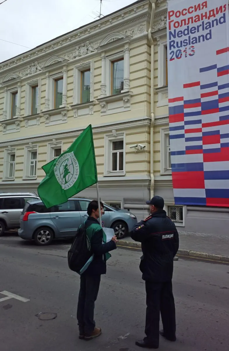 Для акций протеста у посольства Нидерландов были мобилизованы связанные с российскими властями партии. Московское отделение ЛДПР собралось провести пикет перед посольством в знак протеста против действий полиции этой страны в отношении российского дипломата. Лидер партии Владимир Жириновский пообещал разбить все окна в этом посольстве, сообщает «Интерфакс». А Российская экологическая партия «Зелёные» (бывшее движение «Кедр», среди основателей которого был главный санитарный врач Геннадий Онищенко) уже утром 9 октября провела пикет у посольства. Несколько человек с эмблемами партии стояли с листочками формата А4 «Почему в Гааге избивают русских дипломатов?». На сайте партии объясняется, что эта акция «приурочена к событиям, произошедшим в минувшие выходные в Гааге, где был избит и незаконно задержан советник-посланник российского посольства». В информационном сообщении о пикете задержание российского дипломата в Гааге связывается с делом «Арктик Санрайз», а «Гринпис» называется «радикальной экологической организацией. В частности, руководитель молодежного крыла «Зеленых» Ремм Малышкин сказал: «Считаем, что политическая акция против России, которую провели члены радикальной экологической организации «Гринпис» 18 сентября у нефтяной платформы «Приразломная» в Баренцевом море напрямую связана с событиями в Гааге, и мы просто обязаны выступить в защиту интересов граждан России. Мы против того, чтобы антироссийская акция «Гринпис» служила причиной угрозы жизни и здоровью наших сограждан».