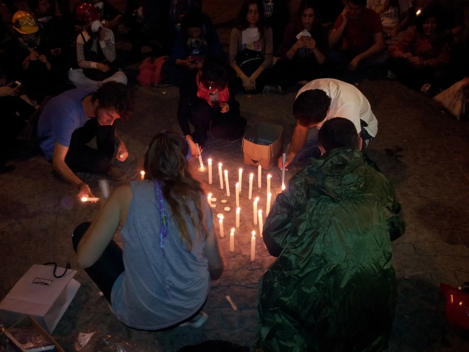 Что-то новое на площади. Действительно, появляются свечи. Люди садятся вокруг, продолжают переговариваться.